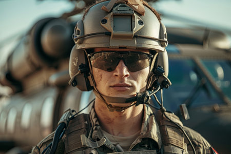 Modern soldier in military uniform and helmet. AI generative.