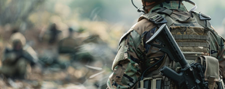 A striking banner with a close-up of a soldier's gear, including a rifle, helmet, and tactical vest, set against a background of a battlefield.