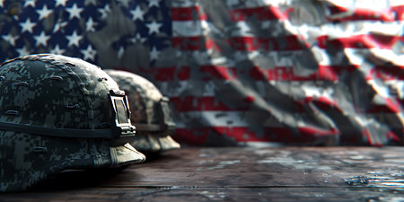 Military Helmet on Stone Pedestal with Empty Plaque for Text Symbolizing American Memorial Day Tribute. Concept of Honor, Sacrifice, Military Remembrance, Patriotism. Copy space. Mockup.