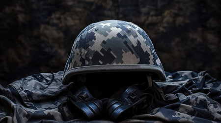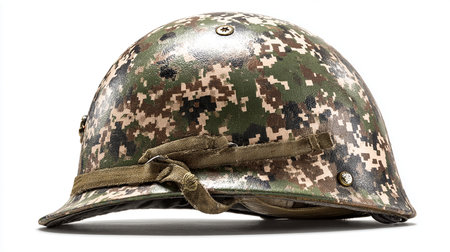 detailed shot of green and brown camouflage patterns on an army helmet, created with generative ai