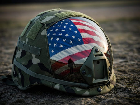 A close-up, poignant image of a soldier's hand, wearing a black tactical glove, resting on a scratched and worn camouflage combat helmet. The image has a somber, cinematic tone with a blurred outdoor background, symbolizing service, sacrifice, remembrance, and the weight of conflict.