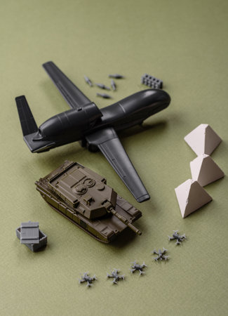 miniature toy soldiers and tank on board. Close up image of toy military at war. Selective focus