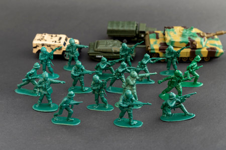 Toy soldiers with military vehicles and tanks marching towards enemy