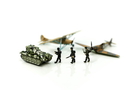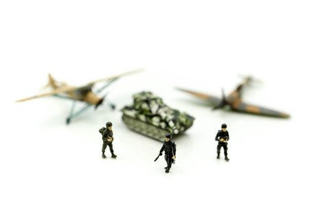 Miniature people : team soldier standing together with army tank and aircraft air combat using for War, army, military, guard concept.