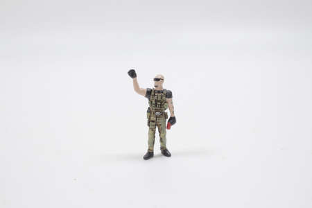 Horizontal shot of hand manipulating a toy soldier on gray background.