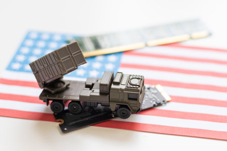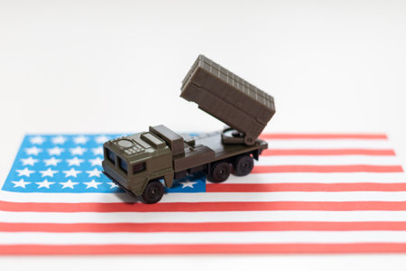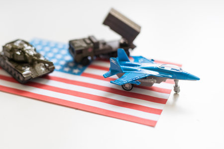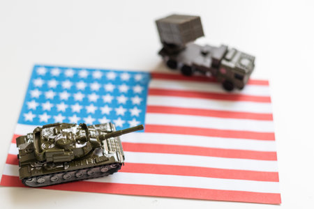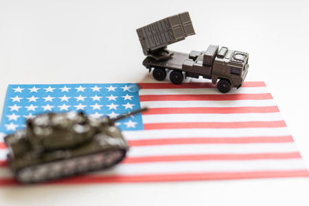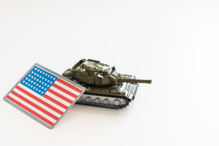 USA flag image photo with a combat plane, khaki green tank and military car standing on american flag
