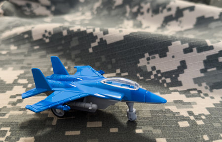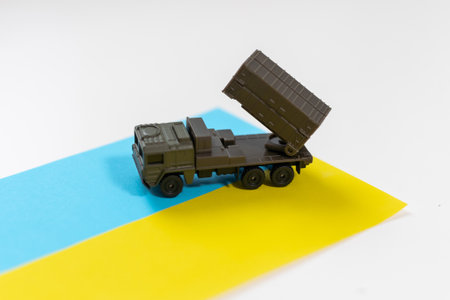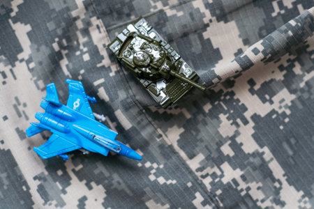 A children's toy plane and soldiers lie on the national flags of Ukraine, the war in Ukraine, the military forces in the country 2022