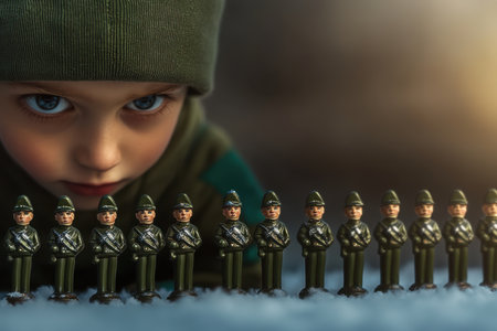 A young child intensely focuses on a line of toy soldiers while playing in the snow on a winter day.