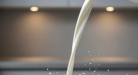 Milk splash pouring into a white cup, stop motion food photography, dramatic lighting, generative AI