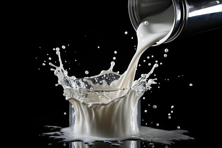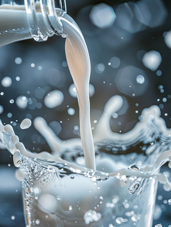 A dynamic close-up of fresh milk being poured, creating a stunning splash and bubbles. Perfect for food and beverage themes in culinary contexts.