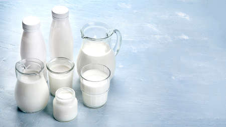 milk products - tasty healthy dairy products on a table on: sour cream in a white bowl, cottage cheese bowl, cream in a a bank and milk jar, glass bottle and in a glass