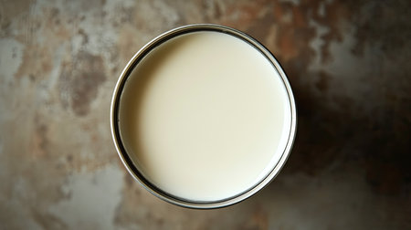 A top view of a can of evaporated milk, smooth and creamy, viewed from above