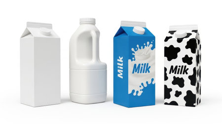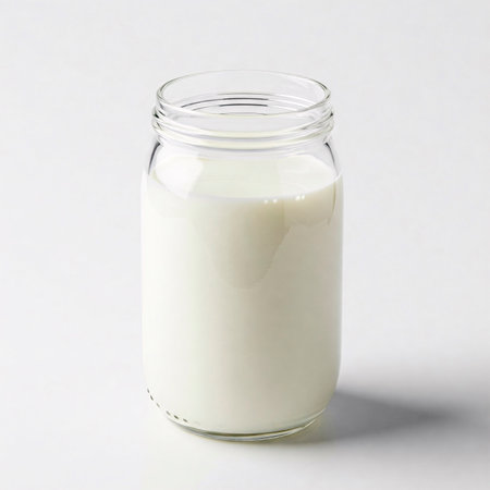 The image features two containers of milk. On the left, there is a blue carton labeled 'MILK' with a white cap. On the right, there is a glass jar filled with white milk and a blue lid.