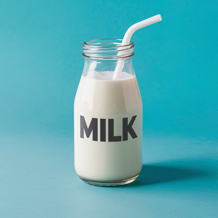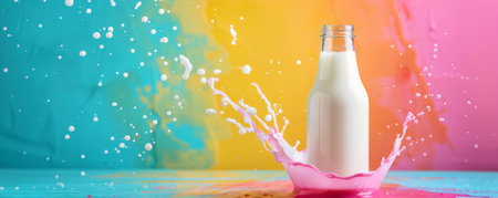 Bottle of milk on a bright color background, with splashes of milk around. The contrasting colors emphasize the freshness and purity of the milk.