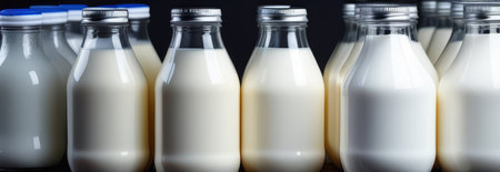 Milk bottles in row Fresh milk dairy product in supermarket fridge