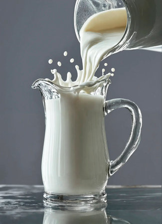 A close-up shot of fresh, white milk being poured into a stainless steel bucket, creating a splash and gentle bubbles on the surface. The image evokes a sense of freshness, dairy farming, and natural, wholesome nutrition.