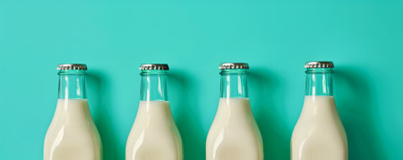 Trendy fermented dairy drinks with probiotics poured from glass bottles on a cool turquoise background. The vibrant hue adds a modern and fresh touch to the presentation.