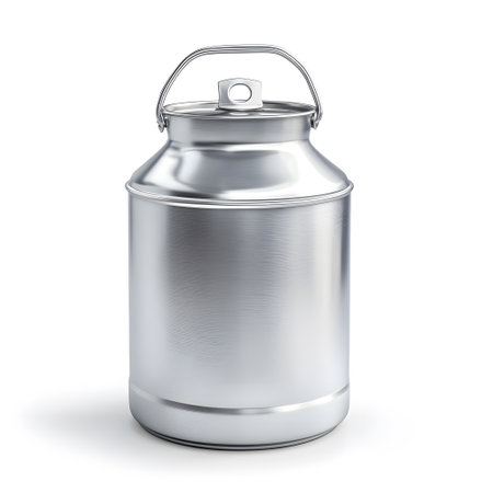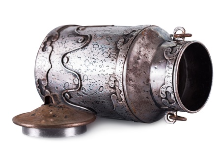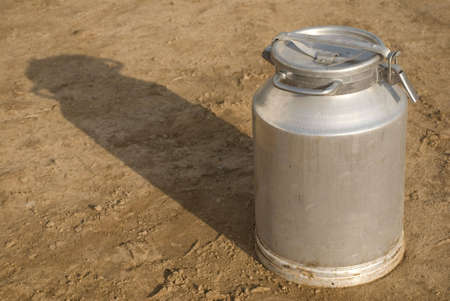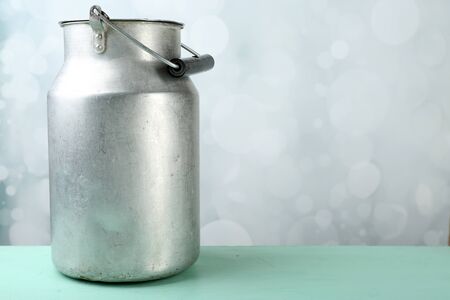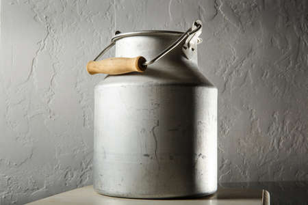 old kind of aluminum bidon for milk storage stands on kitchen table