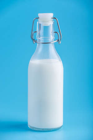 A glass bottle with milk on a blue background. A liter of milk in a glass bottle on a colored background a place for text