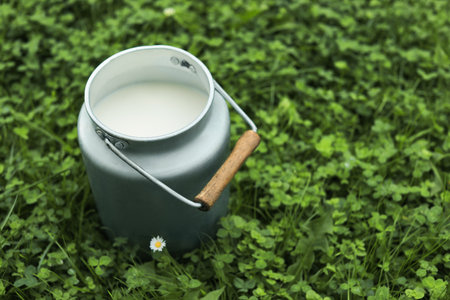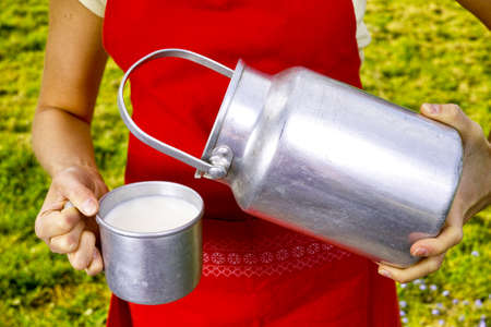 Young woman with fresh organic farm cowmilk in aluminum milk can on green grass background copy space