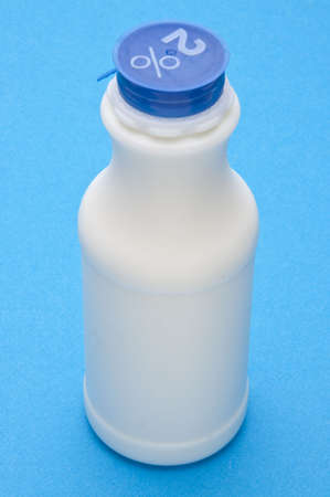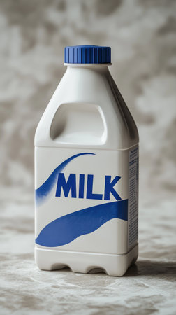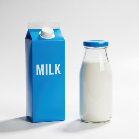 The image features two containers of milk. On the left, there is a blue carton labeled 'MILK' with a white cap. On the right, there is a glass jar filled with white milk and a blue lid.