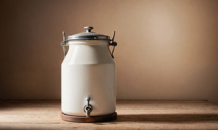 A vintage white milk dispenser sits on a wooden table, ready to pour