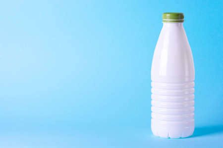 Glass bottle with fresh milk on blue background. Colorful minimalism. The concept of healthy dairy products with calcium