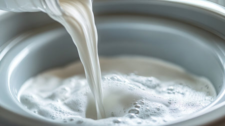 A close-up of detergent pouring into a washing machine, with a neutral background for copy.