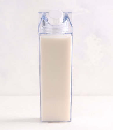 A plain white milk carton stands on a marble countertop in a softly lit kitchen, surrounded by breakfast ingredients
