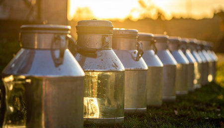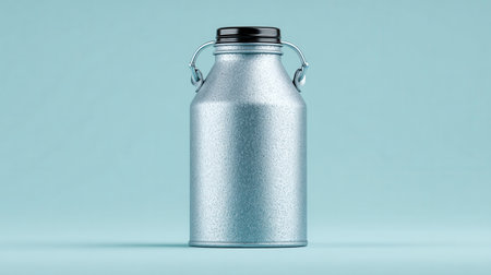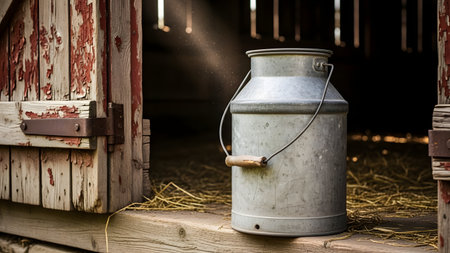 An old, galvanized metal milk churn standing in the doorway of a rustic wooden barn, illuminated by a beam of sunlight with floating dust particles. The image captures a nostalgic scene of traditional dairy farming and rural life.