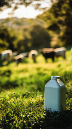 A white milk carton sits on lush green grass in a pasture while cows peacefully graze nearby. The warm sun sets in the background, casting a golden glow.