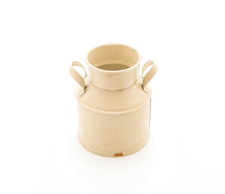 Bucket of milk from the farm, vintage aluminum milk can on wooden floor on old wooden boards background