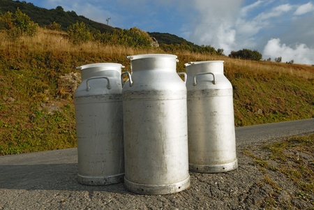 Milk cans ready for collection the evening, facing Mont Blanc, Savoie
