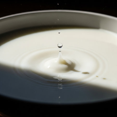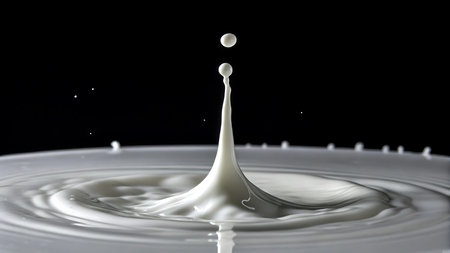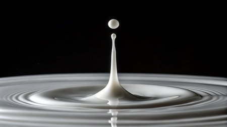 A stunning high-speed photograph captures the mesmerizing moment of milk splashing, creating delicate droplets against a stark black background, showcasing fluid dynamics.