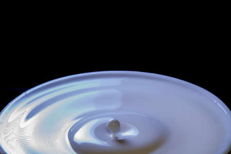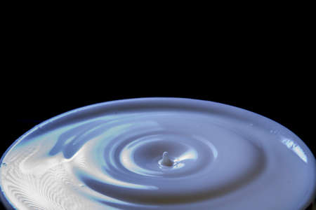 Drop of milk - milk droplet falling on white liquid and creating splash with circle ripple. Dairy products isolated on black background