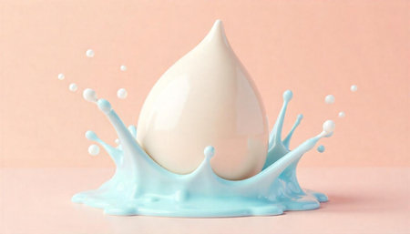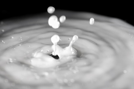 A close-up photograph of a white liquid splash on a black surface, with droplets and a smooth, abstract texture.