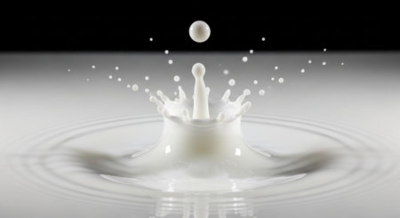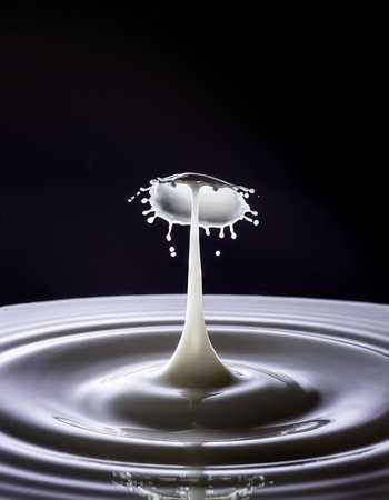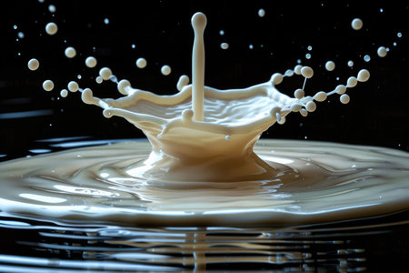 Experience the mesmerizing beauty of milk splashing against a dark backdrop, capturing dynamic droplets in motion and showcasing artistic elegance.
