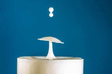 Two drops of milk fall into the long drink glass hitting each other then the liquid surface is shaped like a mushroom