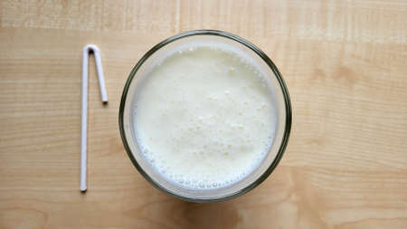 A glass of kefir on the table with a paper tube.