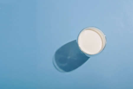 Glass of fresh white milk on blue background. Studio Photo.