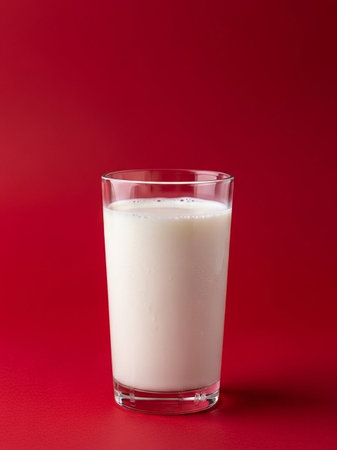 Milk in a glass on a red background. Vertical photo.