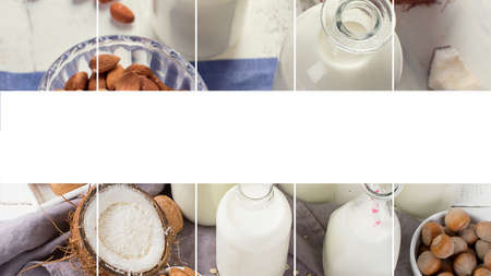 Collage of coconut and almond milk. Non-dairy vegan drink. Vegan drinks concept.