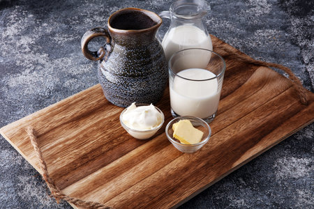milk products - tasty healthy dairy products on a table sour cream in a bowl, cream and milk jar