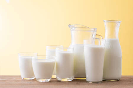 Glasses of different milk on light background