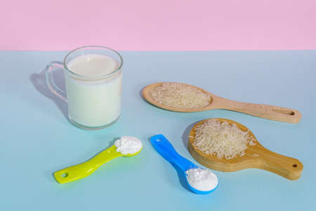 Powdered vegan rice milk. A glass of milk on a multicolored background
