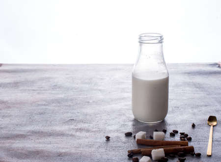 Milk in a glass bottle on the table with a spoon, sugar, coffee beans, cinnamon sticks. Drink.