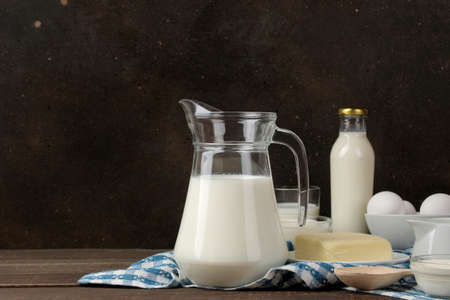 milk products. Milk, sour cream, cheese, butter and cottage cheese on a brown wooden table. space for text