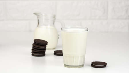 Pouring milk in glass with Homemade chocolate cookies on background