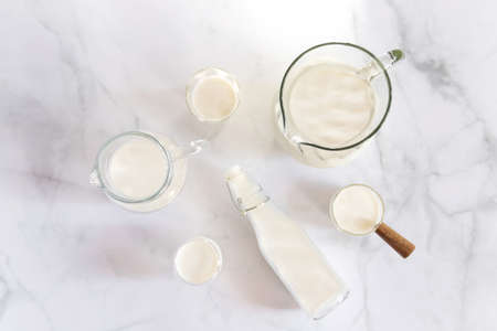 Milk drinks in clear jars and glass of milk on marble table background. Healthy drink concept.