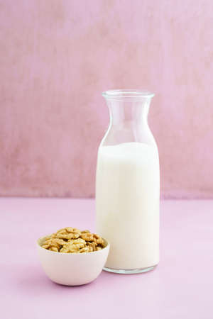 Fresh homemade walnut milk in a bottle with fresh walnuts